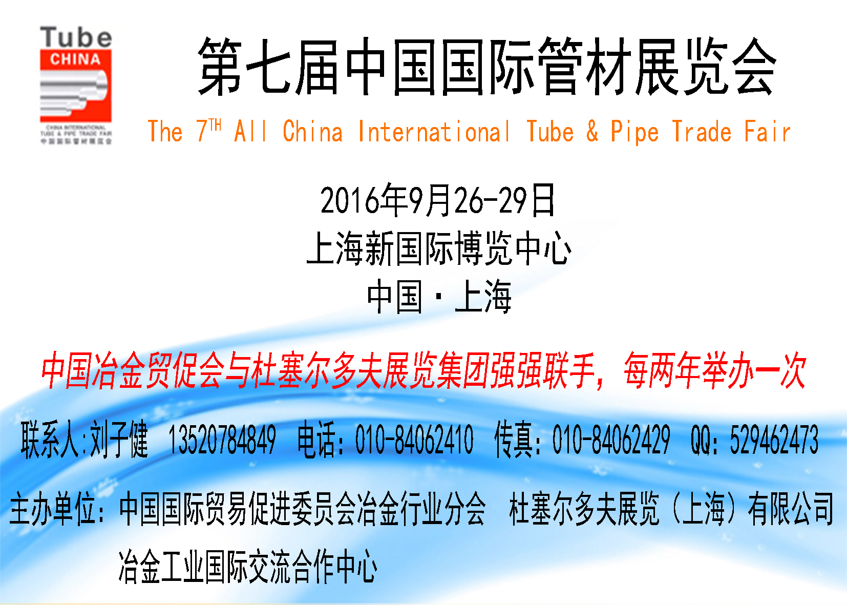 第七屆中國國際管材展覽會 The 7TH All China International Tube & Pipe Trade Fair 2016年9月26-29日 上海新國際博覽中心 中國·上海 中國冶金貿促會與杜塞爾多夫展覽集團強強聯手,每兩年舉辦一次 主辦單位: 杜塞爾多夫展覽(上...